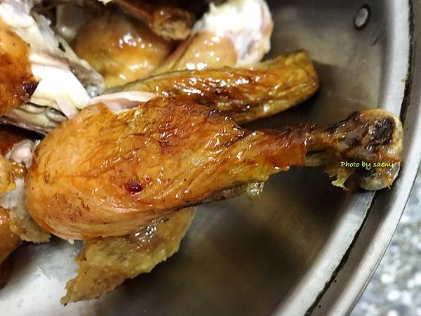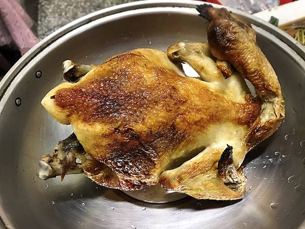 烤得黃澄澄油亮亮,沒有另外再細切,就是整隻全雞喔~