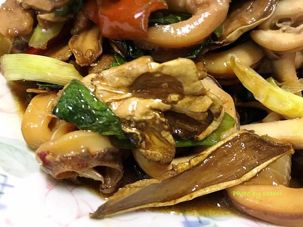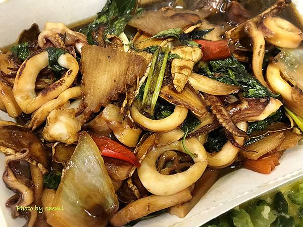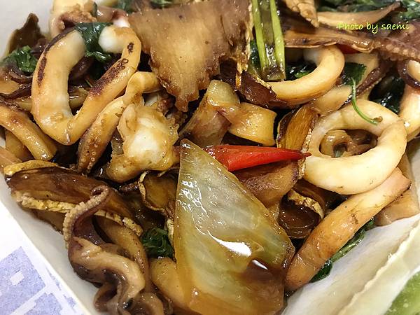所以中卷拌炒著九層塔,薑片,蔥段,辣椒,洋蔥,