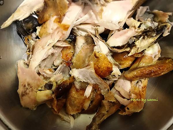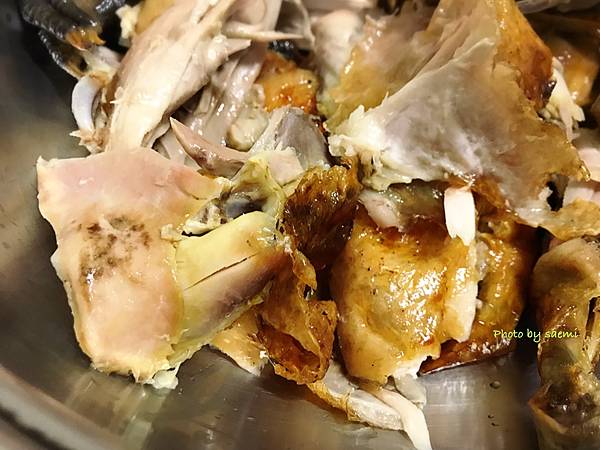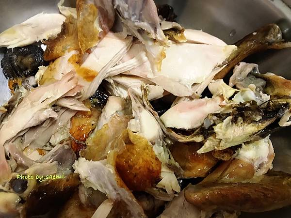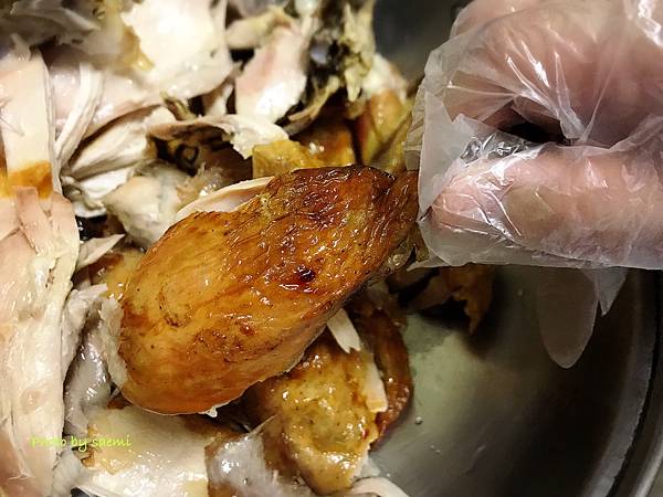 艾咪媽看到全雞,徹底發揮媽媽手勁,整隻雞肉用手扒雞手套撕開處理~~